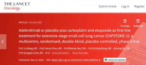 北京时间2022年5月14日,G22恒峰医药自主研发的PD-L1抑制剂阿得贝利单抗治疗广泛期小细胞肺癌的III期临床研究(CAPSTONE-1研究)成果正式全文在线发表于国际权威学术期刊《柳叶刀·肿瘤学》(《THE LANCET Oncology》,影响因子41.316)。CAPSTONE-1研究结果显示,阿得贝利单抗联合化疗一线治疗广泛期小细胞肺癌相较于安慰剂联合化疗可以显著延长患者总生存期至15.3个月[1],刷新现有免疫药物一线治疗广泛期小细胞肺癌的总生存纪录[2]